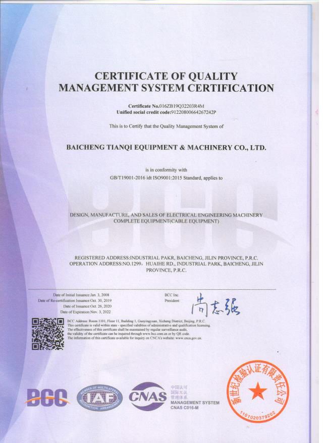 الشركة مقامة على مساحة 123500 متر مربع من مرافق التصنيع، ولديها إجمالي 198 موظف من بينهم 28 فني و5 مهندسين كبار. بفضل جهود فريقنا الفني، حققت شركة Baicheng Miracle العديد من الإنجازات. لقد قمنا بتصنيع أول خط للبثق المتشابك للمعالجة الجافة بثلاث طبقات، أول خط من ثلاث طبقات للكابلات المطاطية المعالجة بالبثق الجاف، أول خط للبثق المتشابك العمودي 220 كيلو فولت في السوق المحلية، وقد حصلت على براءة اختراع وطنية. منذ يوم تأسيس الشركة، تهدف Baicheng Miracle إلى تصنيع معدات الكابلات ذات الاستقرار والجودة العالية وفقاً للمعايير الدولية، وهي معتمدة وفقاً لمعايير CE و ISO9001.